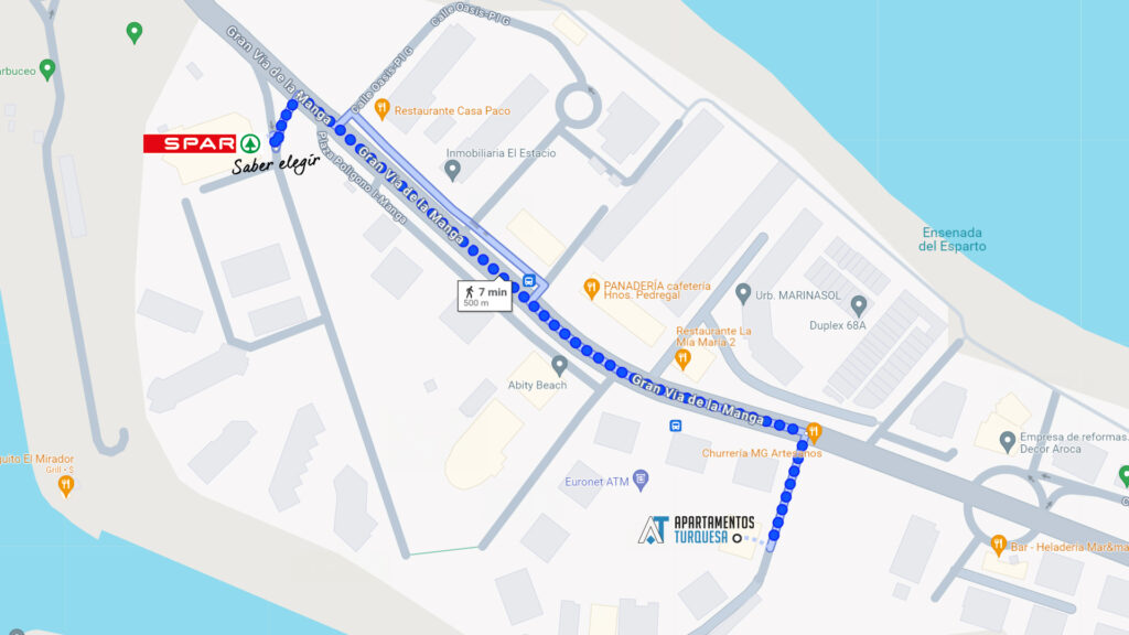 Jednym z wielu atutów naszego apartamentu w La Manga jest jego doskonała lokalizacja. Zaledwie 7 minut pieszo od apartamentu (500 metrów) znajduje się lokalny sklep spożywczy SPAR, gdzie zaopatrzysz się we wszystkie niezbędne produkty.